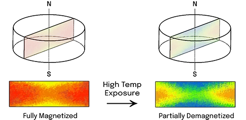 - Max Operating Temperature: If a magnet is heated close to or beyond its maximum operating temperature, it will lose some strength. However, it can usually be remagnetized to recover most of its strength. Remagnetization involves placing the magnet, or the entire device, inside a magnetizing coil.